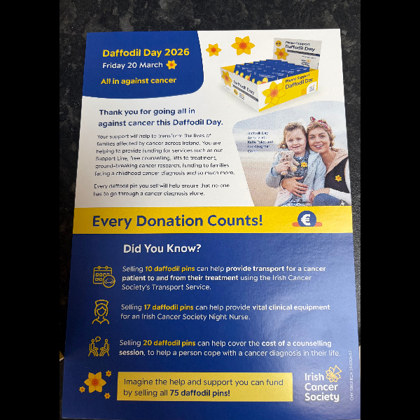 This daffodil day I have decided to fundraise for people who have lost or are fighting their battle with cancer, we sadly lost our Nana who was fighting her battle to pancreatic cancer since October, now she is finally at peace no longer in pain, we want to make sure that everyone suffering can and will get treated, about 44,000 adults and 190 children in Ireland get diagnosed with cancer each year, and by donating today you are helping an elderly or a family on their journey to getting better.
